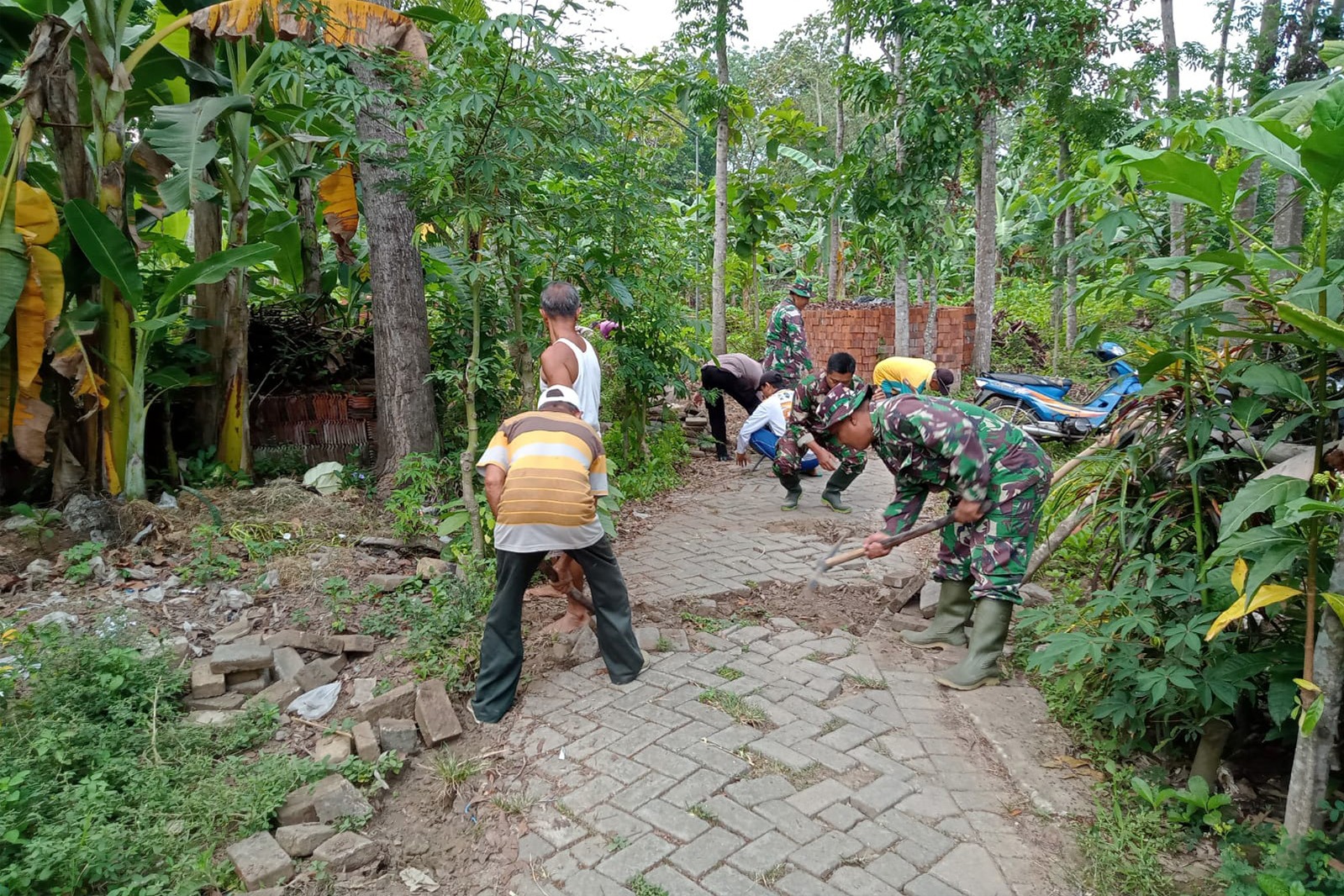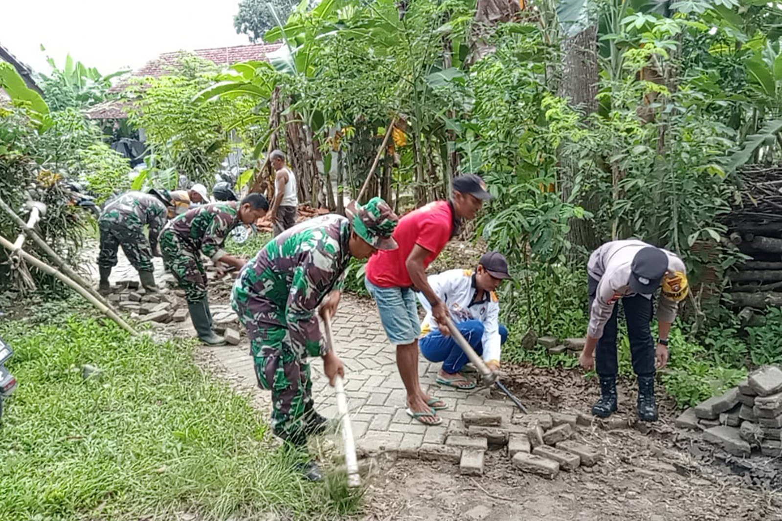 Suasana di lokasi kegiatan menggambarkan semangat kebersamaan. Tampak seragam loreng TNI, cokelat Polri, dan pakaian kerja warga berpadu di satu garis kegiatan. Mereka memanggul batako, menata paving, hingga membersihkan material dengan penuh kekompakan. Sinergi ini menjadi simbol kuatnya tiga pilar desa: TNI, Polri, dan masyarakat.