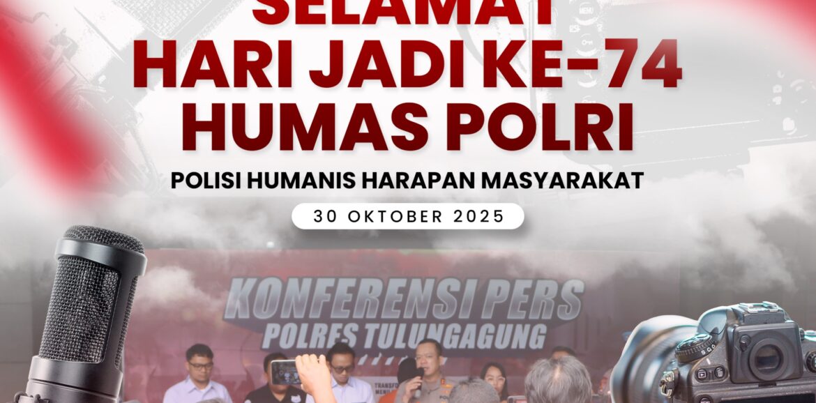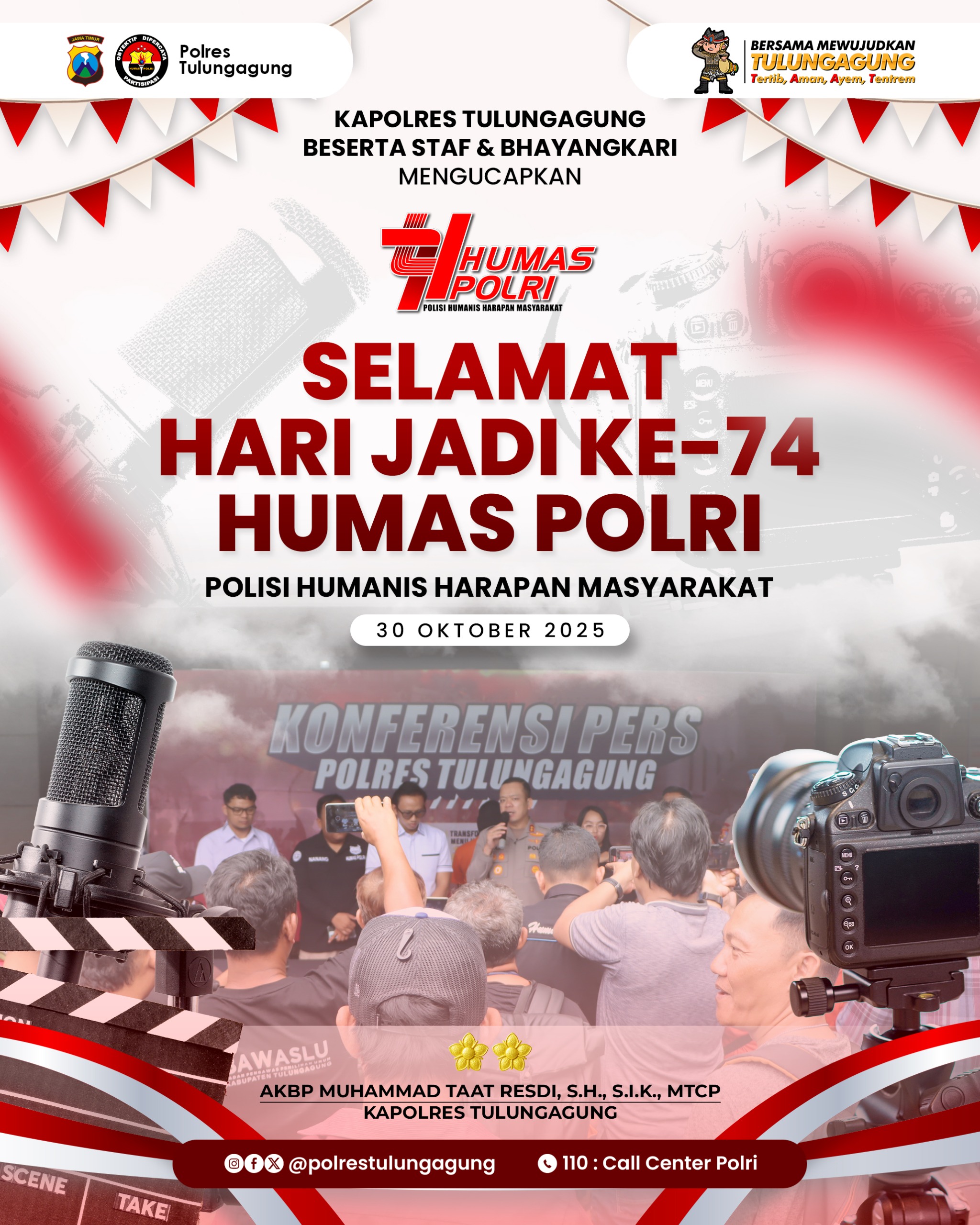 Tulungagung,potretnusantara.web.id – 30 Oktober 2025 – Dalam rangka memperingati Hari Jadi ke-74 Humas Polri, Kapolres Tulungagung AKBP Muhammad Taat Resdi, S.H., S.I.K., MTCP beserta staf dan Bhayangkari menyampaikan ucapan selamat dan apresiasi kepada seluruh jajaran Humas Polri atas dedikasinya dalam menjaga citra dan kepercayaan publik terhadap institusi kepolisian.