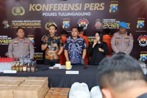 Tulungagung,potretnusantara.web.id – Polres Tulungagung menggelar konferensi pers pengungkapan jaringan peredaran minuman keras (miras) yang dipasarkan secara daring dengan sistem Cash on Delivery (COD), Jumat (07/11/2025). Pengungkapan ini merupakan hasil operasi gabungan Satreskrim dan Satnarkoba Polres Tulungagung.